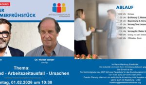 Unter dem Titel „Krankenstand – Arbeitszeitausfall – Ursachen“ fand am 1.2.26 in Hamburg in ganz besonders schönem Ambiente das erste Unternehmerfrühstück des Mittelstandsforums für Deutschland e.V. statt. Als Vortragsgäste waren der Datenanalyst und Sachverständige der Enquete-Kommission des Deutschen Bundestags Tom Lausen sowie der Hamburger Arzt Dr. Walter Weber (Ärzte für Aufklärung) eingeladen. Unter den ca. 70 Teilnehmern befanden sich Unternehmer, Handwerker, am Mittelstand interessierte Bürger und Politiker aus dem Bundestag sowie der Hamburgischen Bürgerschaft. Wir haben ein wunderbares Event mit viel Vermittlung von Wissen, mit Austausch und Vernetzung genossen und freuen uns nun auf die nächsten „Frühstücksrunden“, denn es sind bereits weitere Zusammenkünfte in Planung, die nun ca. alle 3 Monate stattfinden werden, z.B. zu den Themen Energie, Arbeitsmarkt und Bürokratie.Das MSF – Termine von Heilbronn bis Hamburg 20.01.2026