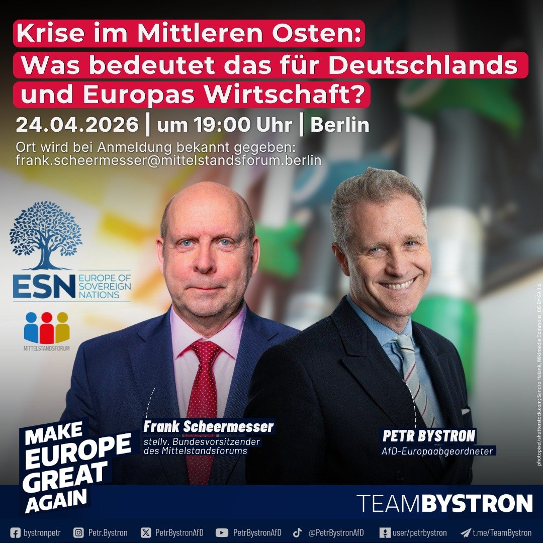 Am 24.04.2026 lädt der MSF-Landesrepräsentant Frank Scheermesser den Europaabgeordneten und ehem. Unternehmer Petr Bystron ein. Thematisiert wird die Auswirkung der Situation im Mittleren Osten auf Deutschland. Details entnehmen Sie bitte der nebenstehenden Einladung. Anmeldungen senden Sie bitte an: frank.scheermesser@mittelstandsforum.berlin