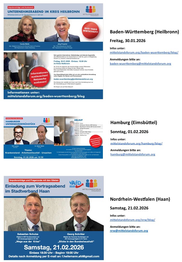 Das Mittelstandsforum für Deutschland e. V (MSF) freut sich über das Umdenken, welches mittlerweile in deutschen Wirtschaftsverbänden stattfindet. Seit Jahren führen wir Veranstaltungen vorrangig mit Mittelständlern durch, deren Probleme die Bundes- und Landespolitik oft ausblendete. Das MSF füllt hier notwendigerweise die Lücke, die die anderen Verbände oft aus politisch motivierten Gründen hinterließen. Wir stehen mittlerweile in allen Bundesländern Unternehmern für Gespräche zur Verfügung.