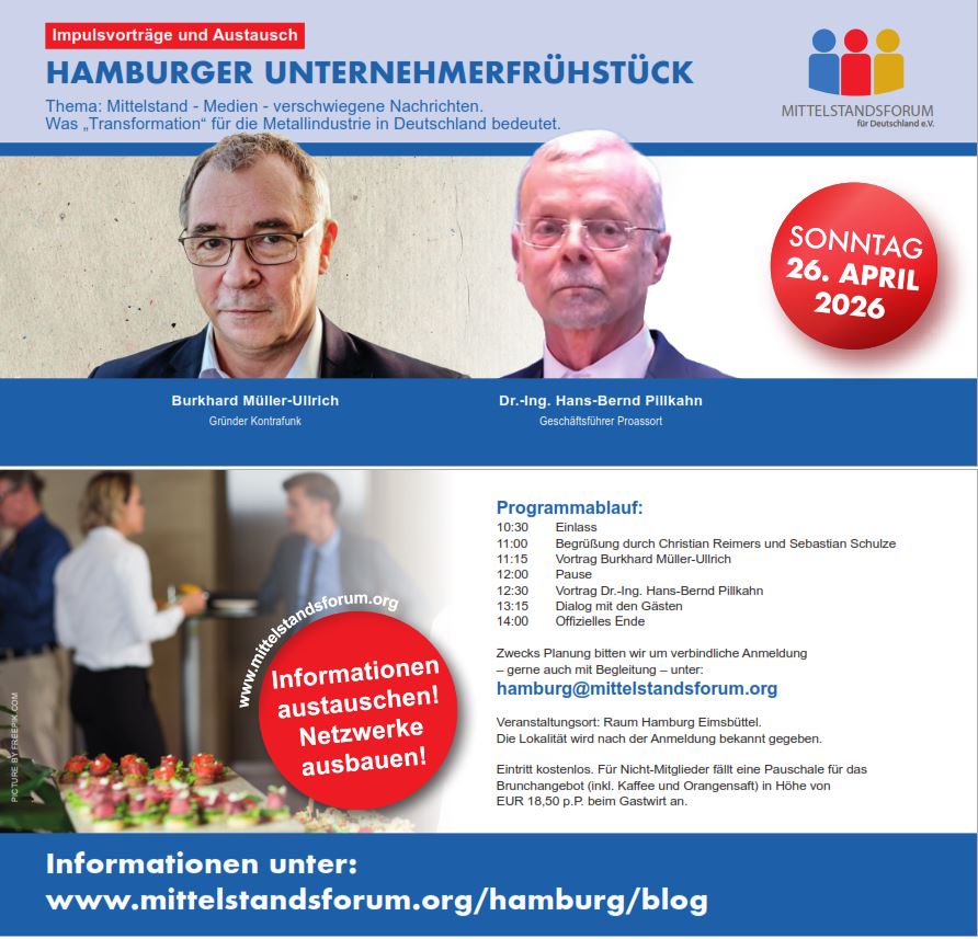 "Nur etwa zehn Prozent der Menschen in Deutschland sagen, dass sie ihre Lebensrealität in den Medien ausreichend wiederfinden. Diese Zahl stammt aus einer Umfrage vom Oktober vergangenen Jahres – sie ist also nicht ganz neu." (OAZ, 20.2.2026). So geht es auch weiten Teilen des Mittelstands, der sich durch die "etablierten Medien" nicht mehr vertreten fühlt. Am 26.4.26 haben wir daher Herrn Burkhard Müller-Ullrich bei uns zu Gast, den Gründer und Programmdirektor des beliebten Radiosenders KONTRAFUNK. Außerdem konnten wir den Unternehmer Dr.-Ing. Hans-Bernd Pillkahn als Redner für uns gewinnen. Dieser beleuchtet die Zukunft der Metallindustrie in Deutschland unter den Bedingungen der sogenannten „Energiewende“. Ein Thema, welches in den Mainstream-Medien kaum Beachtung findet, jedoch in den alternativen Medien und bei uns im Mittelstandsforum ! Im Anschluss stehen die Referenten für Ihre Fragen zur Verfügung. Eingeladen sind Unternehmer / Selbständige, leitende Angestellte und am Mittelstand interessierte Personen. Zwecks Planung bitten wir um verbindliche Anmeldung (gerne auch mit Begleitung) unter: hamburg@mittelstandsforum.org Veranstaltungsort: Bezirk Hamburg-Eimsbüttel. Beginn 11:00 Uhr, Einlass 10:30 Uhr. Die Lokalität wird nach der Anmeldung bekannt gegeben. Der Eintritt ist kostenlos. Für Nicht-Mitglieder fällt eine Pauschale für das Brunchangebot beim Gastronomen in Höhe von EUR 18,50 p.P. an. Wir freuen uns auf Ihren Besuch. Ihr Christian Reimers MSF-Repräsentant Hamburg Mittelstandsforum für Deutschland e.V. www.mittelstandsforum.orgGroßveranstaltung mit MSF Unterstützung 18.03.2026