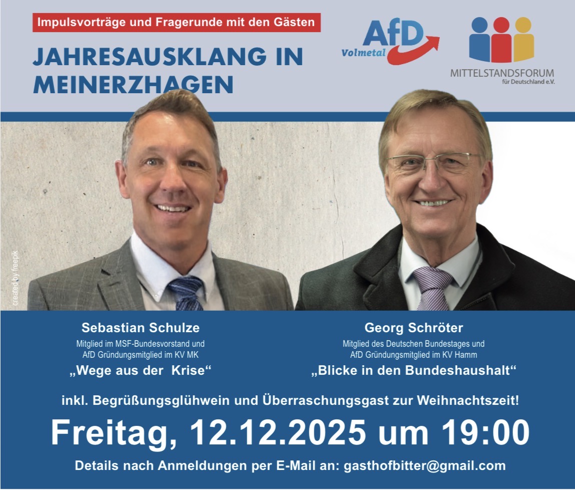 Das Mittelstandsforum für Deutschland lässt das Jahr 2025 bei Glühwein und zwei spannenden Impulsvorträgen ausklingen. Auf Einladung des Gebietsverbandes Volmetal referieren am Freitag, den 12.12.2025 um 19:00 Uhr Georg Schröter als Mitglied des Deutschen Bundestages und Sebastian Schulze als Repräsentant des Mittelstandsforums für Deutschland e.V. in Meinerzhagen (NRW). Im Anschluss an die Impulsvorträge findet ein Dialog mit den Gästen statt. Um einen reibungslosen Ablauf zu gewährleisten, bittet der Gastwirt um eine Anmeldung unter: gasthofbittner@gmail.comMSF bei Anhörung im Thüringer Landtag 04.12.2025