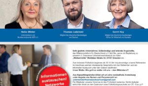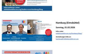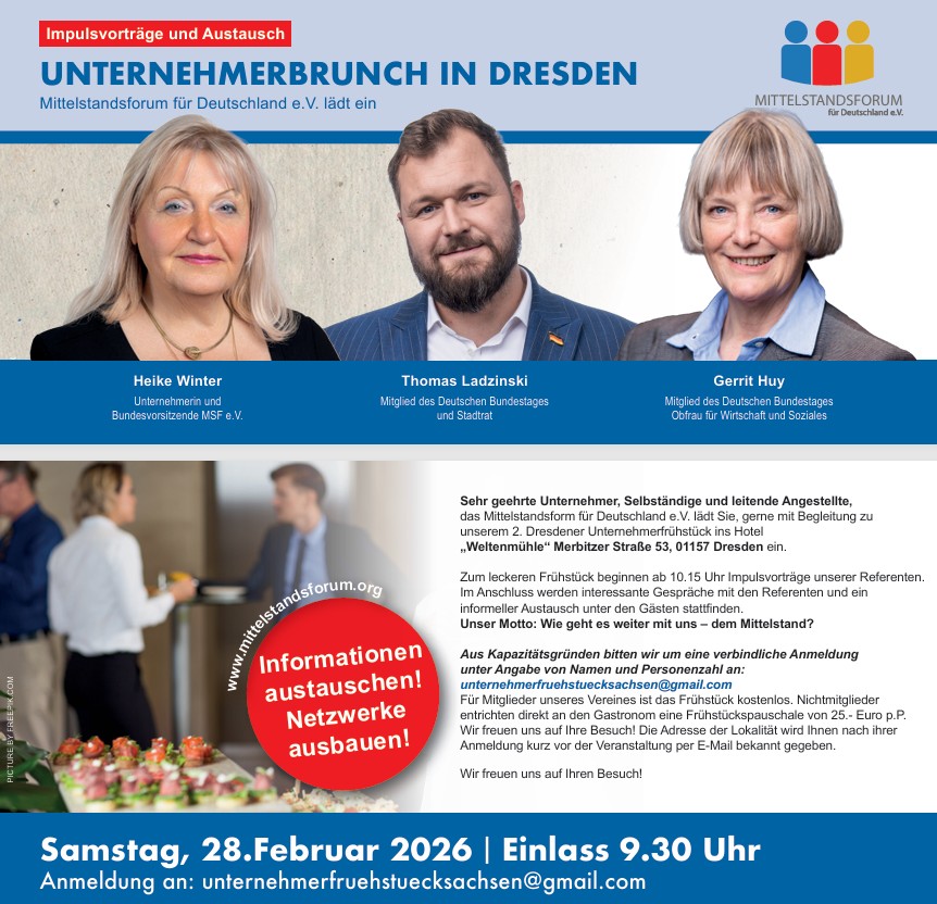 Am Samstag, den 28.02.2026 lädt das Mittelstandsforum für Deutschland e.V. zum Unternehmerfrühstück nach Dresden ein. Die MSF Bundesvorsitzende Heike Winter empfängt die Bundestagsabgeordneten Gerrit Huy und Thomas Ladzinski. Anmeldungen senden Sie bitte an: unternehmerfruehstuecksachsen@gmail.comDas MSF – Termine von Heilbronn bis Hamburg 20.01.2026